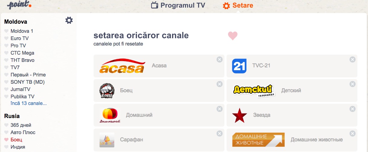 În plus, programa TV a devenit mai accesibilă şi mai comodă, graţie serviciilor suplimentare ale portalului nostru. De exemplu, puteţi crea cu uşurinţă lista proprie a canalelor preferate, pentru a le accesa rapid pe viitor.