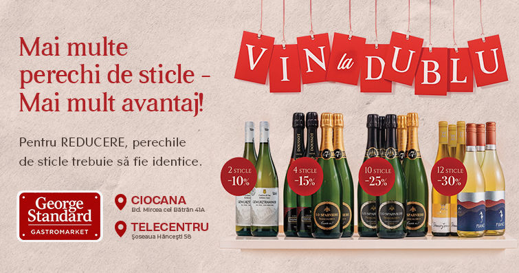 В собственных магазинах бренд расширяет привычный ассортимент и предлагает, в том числе, подборку европейских вин и игристых, включая Prosecco. Такой выбор позволяет покупателям в одном месте собрать полноценный набор к ужину — от основных продуктов до напитков, соответствующих уровню подачи и вкусовым предпочтениям.В рамках развития винной категории в сети действует акция Vin la Dublu, которая мотивирует покупателей пробовать разные позиции и получать возрастающую выгоду в зависимости от объёма покупки.Вино приобретается парами (по 2 бутылки). Размер скидки зависит от количества пар в корзине. Важно: скидка применяется ко всей покупке по акции, а не только к последней паре.2 бутылки (1 пара) → –10% на всё по акции4 бутылки (2 пары) → –15% на всё по акции6 бутылок (3 пары) → –20% на всё по акции10 бутылок (5 пар) → –25% на всё по акции12 бутылок (6 пар) → –30% на всё по акцииКонцепция Vin la Dublu построена вокруг идеи разнообразия выбора: акция рассчитана на формирование корзины из разных пар, чтобы покупатели могли сравнивать стили, страны и вкусовые профили и находить наиболее подходящие варианты для себя.С чего начать, если хотите попробовать разноеВ ассортименте винной полки представлены узнаваемые и востребованные позиции, среди которых:Prosecco Bacio Della Luna, Prosecco Cecilia Beretta, а также Chianti Pasqua и Primitivo di Manduria Masso Antico — универсальные варианты для ужина, встреч и подарка.Адреса магазинов George StandardТелецентр: șos. Hîncești 58Чеканы: Mircea cel Bătrin, 41 A🛒 Также можно купить онлайн: www.ggg.md