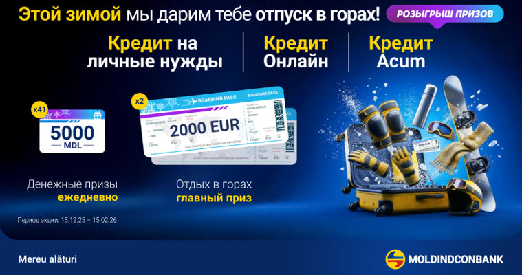 С 15 декабря 2025 года по 15 февраля 2026 года каждый, кто оформит кредит на личные нужды, онлайн-кредит или кредит «Acum», автоматически становится участником розыгрышей призов на протяжении всей кампании.Будь то ремонт, покупка мебели, планирование отпуска, решение срочных задач или просто желание сделать шаг вперед — банк стремится быть надежной поддержкой в действительно важных моментах.Что можно выиграть?Ежедневные призы: по 5 000 леев каждый рабочий день в рамках акции (всего 41 приз). Розыгрыши проводятся раз в неделю.Главные призы: два сказочных отпуска в горах. Розыгрыш проводится в конце каждого месяца акции.Кроме того, в период акции те, кто оформит кредит на личные нужды или онлайн-кредит, получат специальные условия.Подробности об акции смотри в регламенте здесь.Moldindconbank – mereu alături!