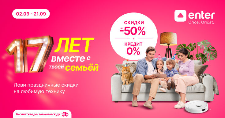 Мы благодарим тебя за то, что выбираешь Enter для важных и повседневных моментов: от утренней суеты до тихих, уютных вечеров, где всё работает так, как нужно тебе.Так как каждый праздник нужно отмечать вместе, приходи к нам, в любой магазин Enter и воспользуйся праздничными скидками до 50% и кредитом под 0% на всё, что пожелаешь.Но это ещё не все сюрпризы! Мы подготовили супер цены на целые категории товаров, чтобы тебе было легче найти всё для себя, для дома или для близких. Ознакомься с предложениями ниже и подбери идеальную технику для своего дома!Аэрогриль Mova - 1 399 леевГазовая варочная панель Daewoo - 1 499 леевВертикальный пылесос Mova - 1 699 леевДуховой шкаф Daewoo - 2 999 леевСтиральная машина SHARP - 5 999 леевПосудомоечная машина SHARP- 4 999 леевХолодильник Gorenje с нижней морозильной камерой - 6 999 леевСмартфон Poco X7 Pro - 7 499 леевТелевизор LG 50 inch - 7 699 леевЖдём тебя в магазинах Enter, чтобы вместе отпраздновать 17 лет отличными предложениями и супер скидками на множество товаров. Скидки доступны со 2 по 21 сентября. А если ты предпочитаешь комфортный шопинг дома, тогда закажи всё онлайн, а мы доставим бесплатно по всей стране.