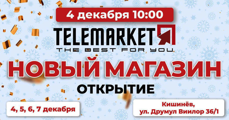26 магазин в преддверии 2026 года, в месяц предновогодних чудес, волшебства и подарков Официальное открытие 4 декабря в 10:00 Вас приглашают в гости прекрасные новогодние эльфы с конкурсами, танцами и с мешком подарков. Эльфы выберут из гостей счастливчика, который разрежет красную ленту перед открытием дверей нового магазина!Новогодние подарки для всех гостей с 4 по 7 декабря Telemarket дарит гарантированные подарки каждому покупателю:покупка от 249 лей — фирменная сумкаот 299 лей — сертификат на –25%от 349 лей — выберете себе гарантированный подарок и получите БОНУСОМ статус TOP UDS (пожизненная индивидуальная скидка –15% во всех магазинах сети)от 499 лей — денежный сертификат до 100 лейСкидки в честь открытия и выгодная цена на топ товары только в одном магазине и в on-line с заявкой на сайте www.telemarket.md Все товары будут доступны со скидкой от –22% до –50%С Telemarket всегда выгодно покупать! Это сеть розничных магазинов в Кишиневе и по всей Молдове. В продаже все для Вашего быта, дома и личной гигиены. Бытовая химия, косметика, товары для женщин, мужчин и детей по доступным и выгодным ценам с быстрой доставкой до двери Вашего дома. Мы официальный дистрибьтор брендов HighGenic, VATAN, Orience, DecoBella, Urve, Magus, Active, MIX, Gondol, White Day, Wellnax, Pafilya, Wokali, Luma Bella. Более 10 лет мы гарантируем качество, лучший сервис и низкие цены на все лучшее для тебя! Заходите по ссылке www.telemarket.md и оформляйте заявку со скидками на все товары в ассортименте Telemarket с 4 по 7.12.Не забудьте выбрать себе подарок при покупке на сумму от 349 лей Воспользуйтесь возможностью – покупайте! Экономьте! Получайте подарки!