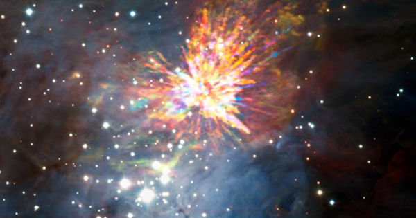 "Такие взрывы протозвезд бывают крайне скоротечными, но они могут достаточно часто происходить внутри "звездных яслей". Взрывая те облака газа, в которых они рождаются, такие "протосверхновые" могут выступать одним из ограничителей скорости роста звезд в подобных гигантских звездных яслях", — заявил Джон Бэлли (John Bally) из университета Колорадо в Боулдере (США).Туманность, или облако Ориона представляет собой одни из самых крупных "звездных яслей" в Галактике. Оно расположено в примерно 1500 световых годах от Земли и занимает несколько сотен световых лет. Здесь формируются десятки и сотни молодых светил, некоторые из которых обладают достаточно необычным обликом и свойствами, чтобы привлечь внимание ученых.Бэлли и его коллеги наблюдали за одним из центральных частей этого облака, известное ученым под именем OMC-1, где содержится примерно в 100 раз больше газа, чем весит Солнце. Около 100 тысяч лет назад в нем начали формироваться новые светила, многие из которых расположены друг к другу так близко, что их силы притяжения начинают влиять друг на друга.Два таких зародыша, как показали снимки с телескопа ALMA, крупнейшей микроволновой радиообсерватории мира на чилийском плато Чахнантор, примерно 500 лет назад сблизились и, предположительно, столкнулись, породив мощную вспышку и разогнав весь газ туманности OMC-1, заплетая его в сотни отдельных потоков, подобно искрам фейерверка.Сила этого столкновения и мощность последовавшего за ним взрыва была таковой, что газ бывшей туманности сейчас движется со скоростью в 150 километров в секунду в стороны от эпицентра этого "фейерверка", что примерно равно скорости, с которой Солнце вращается вокруг центра Галактики. Сами звезды, как показывают эти фотографии, пережили это столкновение и сейчас разлетаются со скоростью примерно в 13 и 29 километров в секунду.Следы этого взрыва сейчас хорошо заметны и на оптических, и на микроволновых снимках туманности, однако через несколько сотен лет, по словам астрономов, они полностью исчезнут и станут невидимыми для нас. Такие взрывы, как сейчас считают Бэлли и его коллеги, могут происходить в "звездных яслях" достаточно часто, что объясняет то, почему частота рождения звезд в некоторых из них гораздо ниже теоретических значений."Люди в большинстве случаев считают, что только пожилые светила могут заканчивать свою жизнь взрывом, подобно вспышкам новых и сверхновых звезд. Телескоп ALMA показал, что аналогичные вещи могут происходить и на противоположном конце жизненного цикла звезд", — заключает Бэлли.
