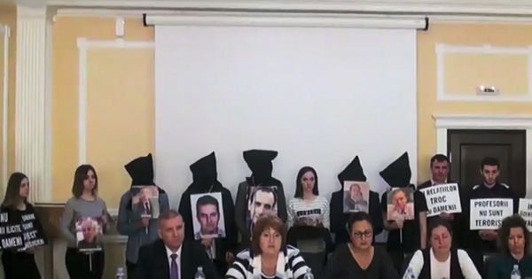 На пресс-конференции они появились с мешками на головах и веревками на шеях, передает publika.md.Директору лицея Валентине Олару грозит выговор. Сама она говорит, что об отсутствии учеников на уроках не знала. И что ждет письменных объяснений от детей и родителей. В министерстве же отмечают, что администрация лицея несет ответственность за случившееся."Очень жаль, если руководитель не знает, что происходит в учебном заведении. Те, кто увел детей с уроков, были обязаны сообщить руководству лицея. А руководство, в свою очередь, обязано отчитаться перед муниципальным управлением образования", - говорит глава управления министерства образования Валентин Круду.В Amnesty International Moldova на публикации в прессе ответили официальным заявлением. Говорится в нем, что школьники сами проявили интерес к участию в мероприятии, а у организаторов попросили подтверждающий документ, чтобы предъявить его администрации школы. Знали ли об этом родители, не уточняется.Акцию Amnesty International приурочила к визиту президента Турции Реджепа Эрдогана. Протестовали они против высылки из Молдовы семи турецких граждан, работавших в сети частных лицеев "Горизонт".
