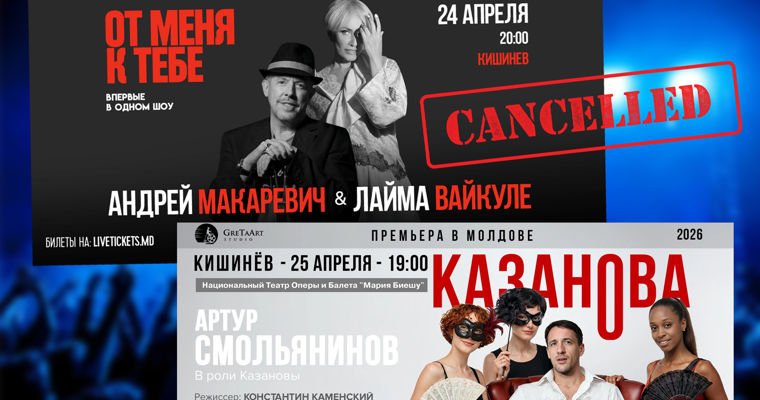 По словам организаторов, Вайкуле и Макаревич отменили совместное выступление в Кишиневе по собственной инициативе. Изменился формат запланированного ранее концерта. Изначально выступление должно было пройти 24 апреля, однако событие не состоится в заявленном виде.Организаторы сообщили о переносе и одновременно изменении программы: вместо совместного концерта зрителям предложат выступление группы "Машина времени". Новая дата - 14 июня, площадка остаётся в Кишинёве.В обновлённой афише отсутствует участие Вайкуле, а концерт позиционируется как полноценное шоу "Машины времени" с известными хитами. Министерство культуры Молдовы одобрило выступление "Машины времени" в столице.По сообщениям в социальных сетях, спектакль "Казанова", в котором главную роль играет российский актер Артур Смольянинов, также был отменен. Причина не уточняется.