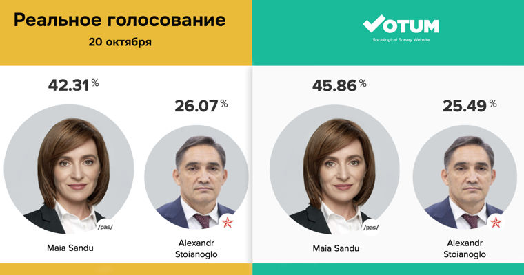 По данным ЦИК, победу в первом туре выборов одерживает кандидат от PAS Майя Санду. Реальное голосование (данные на момент выхода новости, 99,67%):1. Майя Санду - 42,31%2. Александр Стояногло - 26,07%Голосование на Votum.md1. Майя Санду - 45,86%2. Александр Стояногло - 25,49%Результаты опроса iData 1. Майя Санду - 29,5% 2. Ренато Усатый - 13,3%Результаты опроса Watchdog.md 1. Санду - 35,8% 2. Стояногло - 9%Напомним, социологический опрос Votum.md о муниципальных выборах в Кишиневе в 2018 и 2019 годах также показал самые точные результаты из всех представленных барометров общественного мнения.Votum.md — онлайн-платформа, которая проводит независимые социологические опросы. Она не поддерживается и не финансируется ни одной из политических партий. Цель ее опросов — выявить действительные политические предпочтения молдавских пользователей и их мнение по важным социальным, экономическим вопросам.