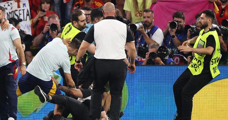 Нападающий сборной Испании Альваро Мората получил травму во время празднования выхода в финал чемпионата Европы по футболу, передает rbc.ruИспания 9 июля победила Францию со счетом 2:1 в полуфинале Евро.Стюард пытался остановить выбежавшего к игрокам болельщика, но поскользнулся и влетел в капитана национальной команды Испании, который получил сильный удар по правой ноге. Форвард после этого самостоятельно покинул поле, но прихрамывал и морщился от боли.В групповом раунде Евро стюард в аналогичной ситуации сбил португальского нападающего Гансалу Рамуша.
