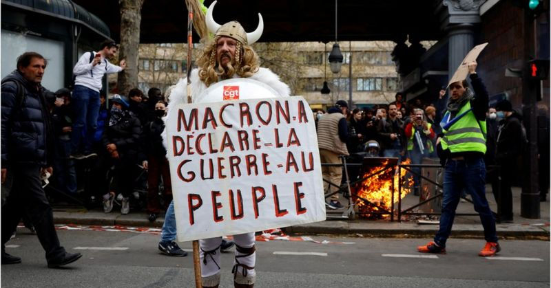 Участники протеста выступают против повышения пенсионного возраста с 62 до 64 лет В числе прочего демонстранты напали на парижский ресторан La Rotonde, куда любит заходить президент Франции Эммануэль Макрон, сообщает bbc.comОколо ресторана выстроились полицейские заграждения. Протестующим удалось поджечь вывеску, однако пожар быстро потушили. После беспорядков, вспыхнувших в предыдущие дни, на улицах Парижа находилось большое количество полиции.В ходе протестов полиция вынуждена защищать банки и прочие офисы, которые могут стать мишенью погромщиков. Французский спецназ занимает позиции перед офисом банка Credit Agricole. Протестующих в Ренне пытались разогнать с помощью слезоточивого газаУ протестующих, в том числе, были плакаты с надписями “Макрон объявил войну народу”. Многие во Франции недовольны действиями президента. Согласно опросам, с реформой категорически не согласны более двух третей французов. Десятки демонстрантов были задержаны в ходе протестов. Среди организаторов протеста - французский профсоюз CFDT. Профсоюзы возмущены тем, что президент Макрон решил принять закон о реформе в обход парламента.Акции протеста состоялись уже в 11-й раз. В самые активные дни на улицы выходило более миллиона человек.